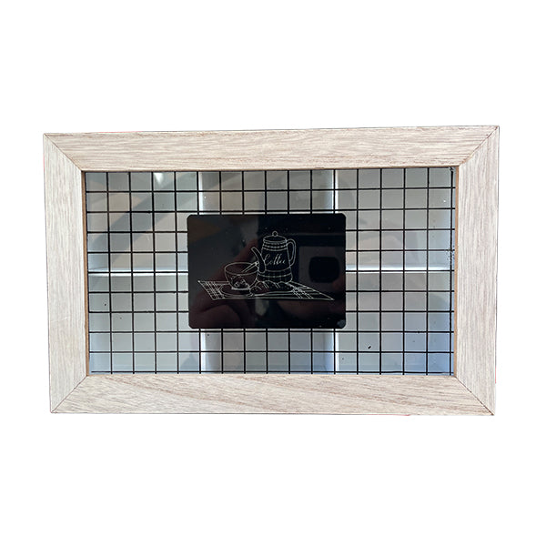 Esta caja organizadora de té cuenta con 6 compartimentos internos para clasificar tus bolsitas de té por sabor o tipo. Su tapa con diseño de rejilla metálica y detalle gráfico en blanco y negro le da un toque único y decorativo que combina perfectamente con cocinas contemporáneas o minimalistas.